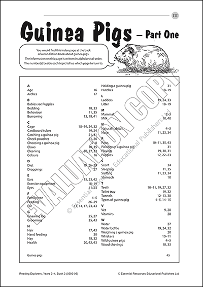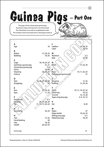 This unit consists of three differentiated versions of the same text plus a page of related activities. The text is an example of an index page from a book about guinea pigs. Teachers might choose to use this text as an example of informative writing or as a way to improve research skills. The activity page includes comprehension questions about the structure and content of the text as well as evaluative questions that can lead onto higher order thinking discussions. Selected answers are provided.